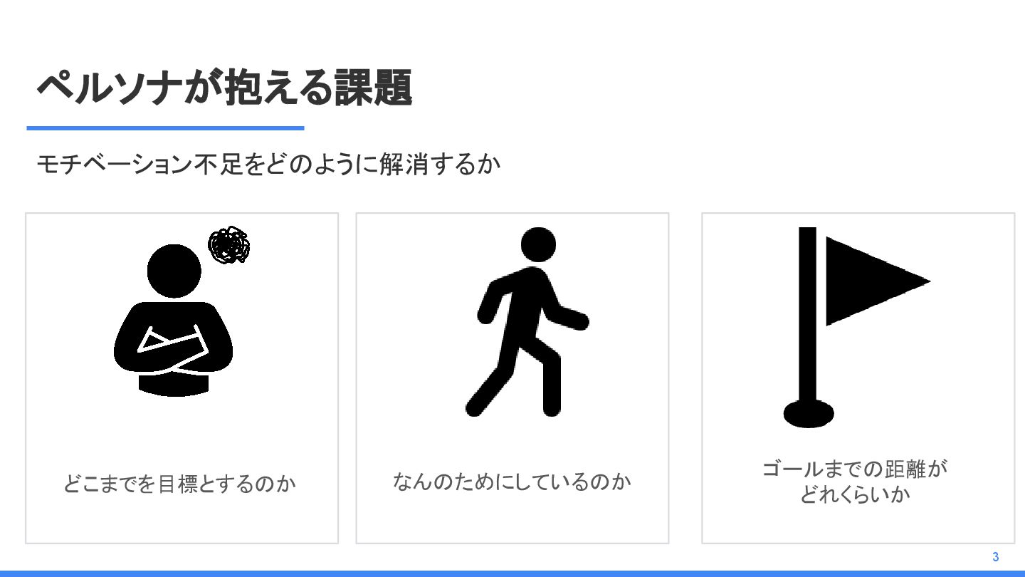 ペルソナが抱える課題 モチベーション不足をどのように解消するか 3 なんのためにしているのか ゴールまでの距離が どれくらいか どこまでを目標とするのか