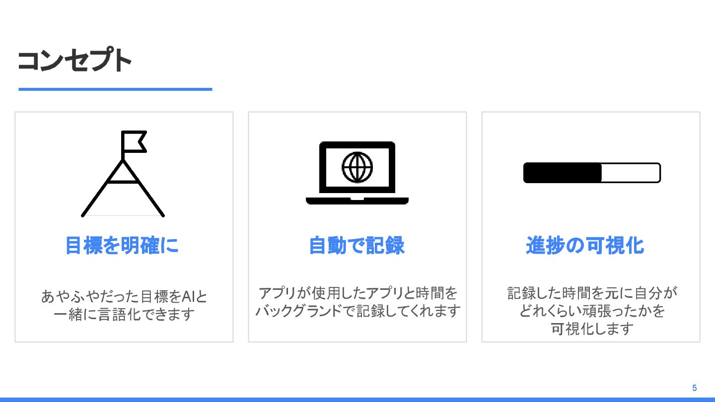 コンセプト 5 目標を明確に 自動で記録 あやふやだった目標をAIと 一緒に言語化できます アプリが使用したアプリと時間を バックグランドで記録してくれます 記録した時間を元に自分が どれくらい頑張ったかを