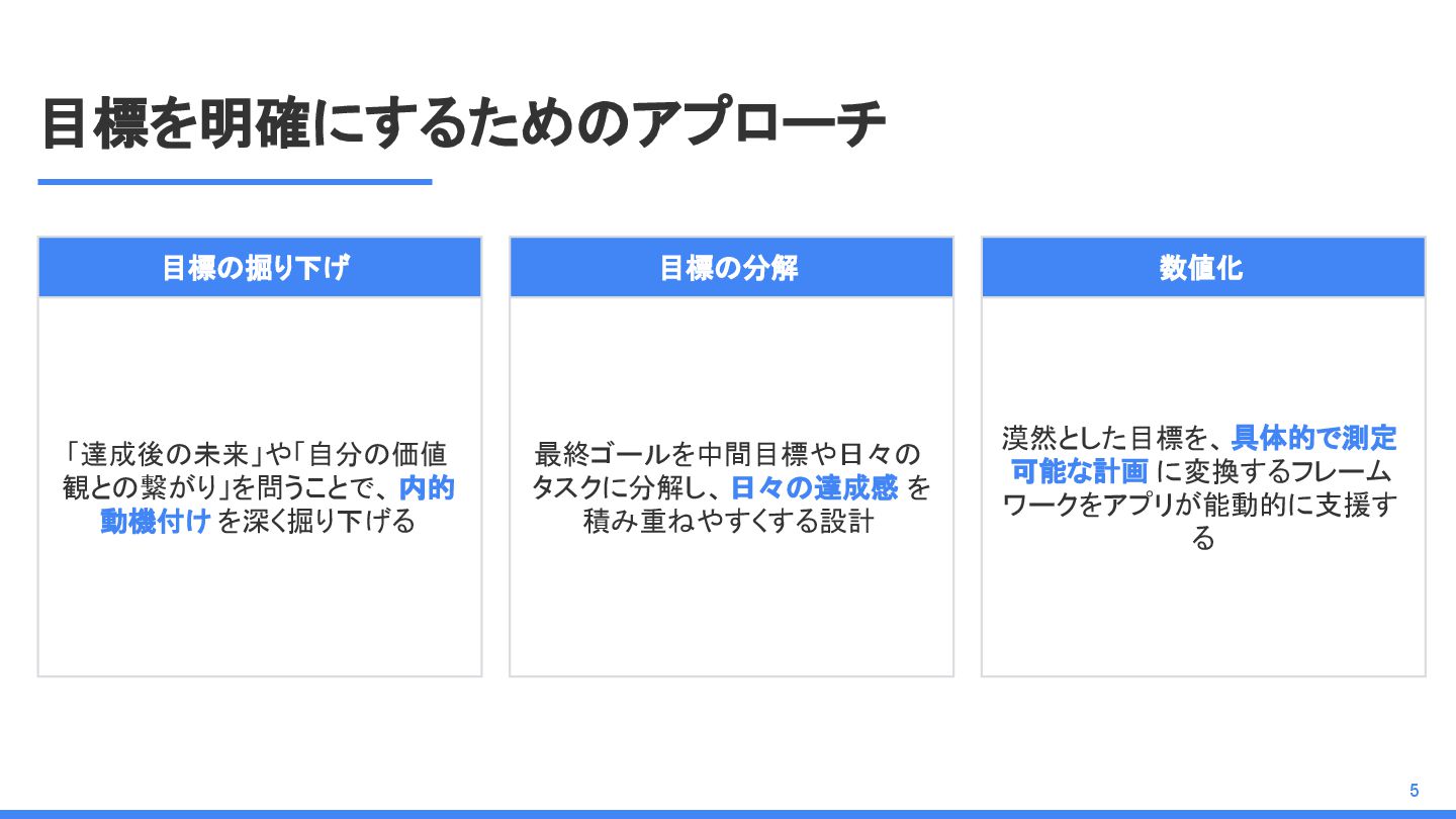 目標を明確にするためのアプローチ 目標の掘り下げ 「達成後の未来」や「自分の価値 観との繋がり」を問うことで、 内的 動機付け を深く掘り下げる 数値化 漠然とした目標を、具体的で測定 可能な計画