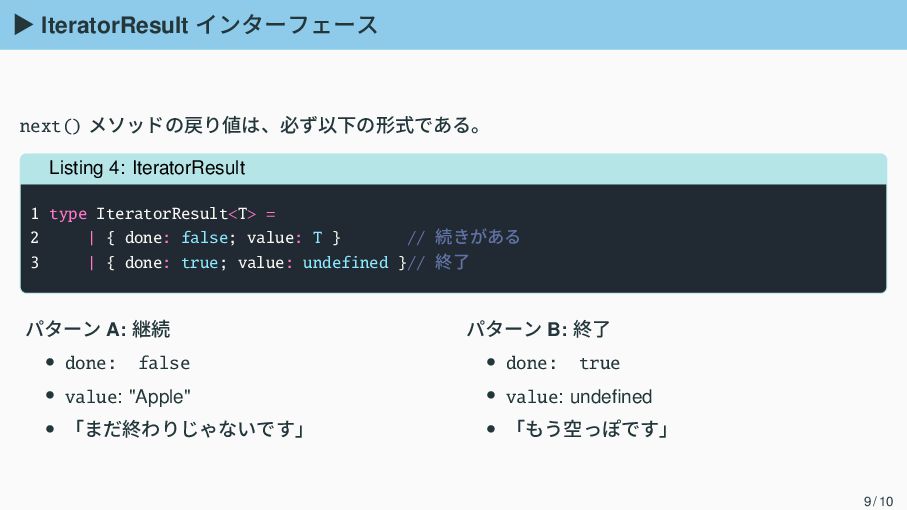 IteratorResult<T> = 2 | { done: false; value: T } // 続きがある 3 | { done: true; value: undefined }// 終了 パターン A: 継続 • done: false • value: "Apple" • 「まだ終わりじゃないです」 パターン B: 終了 • done: true • value: undefined • 「もう空っぽです」 9 / 10