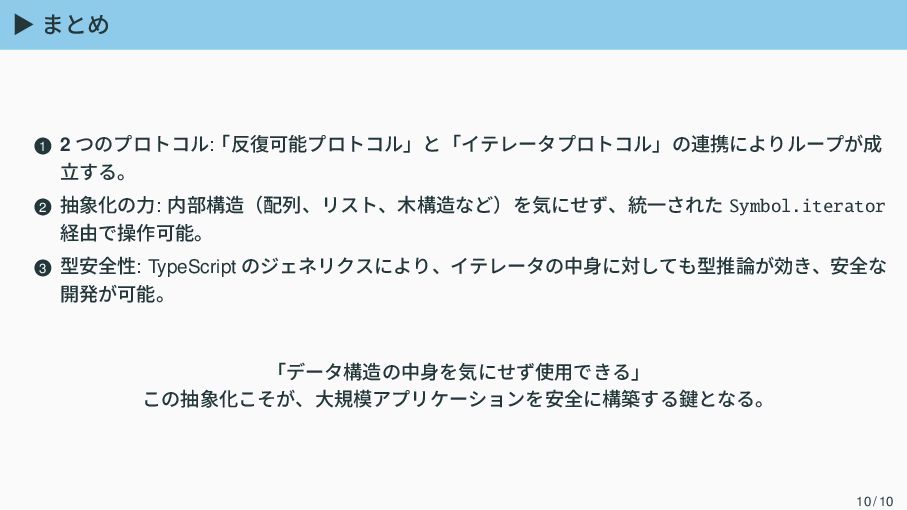 経由で操作可能。 3 型安全性: TypeScript のジェネリクスにより、イテレータの中身に対しても型推論が効き、安全な 開発が可能。 「データ構造の中身を気にせず使用できる」 この抽象化こそが、大規模アプリケーションを安全に構築する鍵となる。 10 / 10
