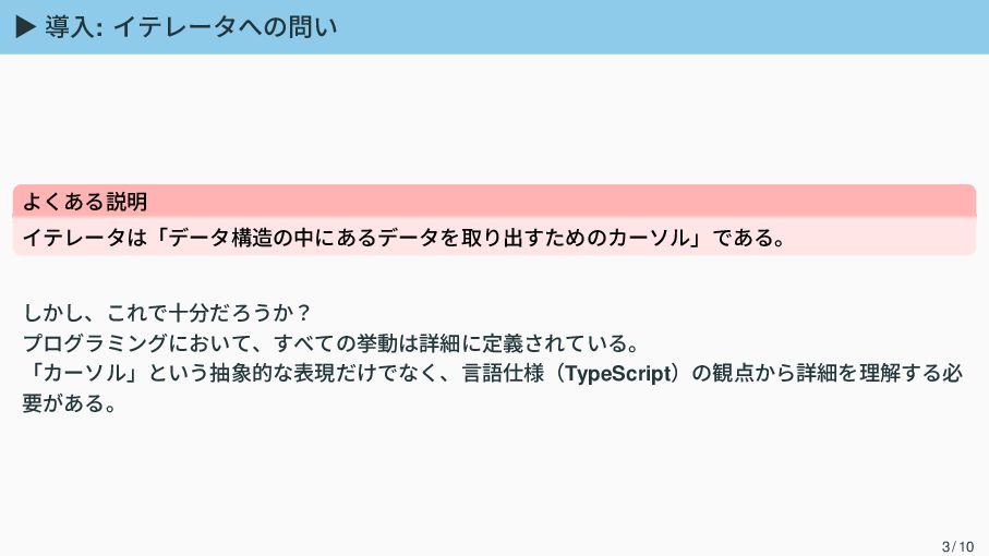 ▶ 導入: イテレータへの問い よくある説明 イテレータは「データ構造の中にあるデータを取り出すためのカーソル」である。 しかし、これで十分だろうか? プログラミングにおいて、すべての挙動は詳細に定義されている。 「カーソル」という抽象的な表現だけでなく、言語仕様(TypeScript)の観点から詳細を理解する必 要がある。 3