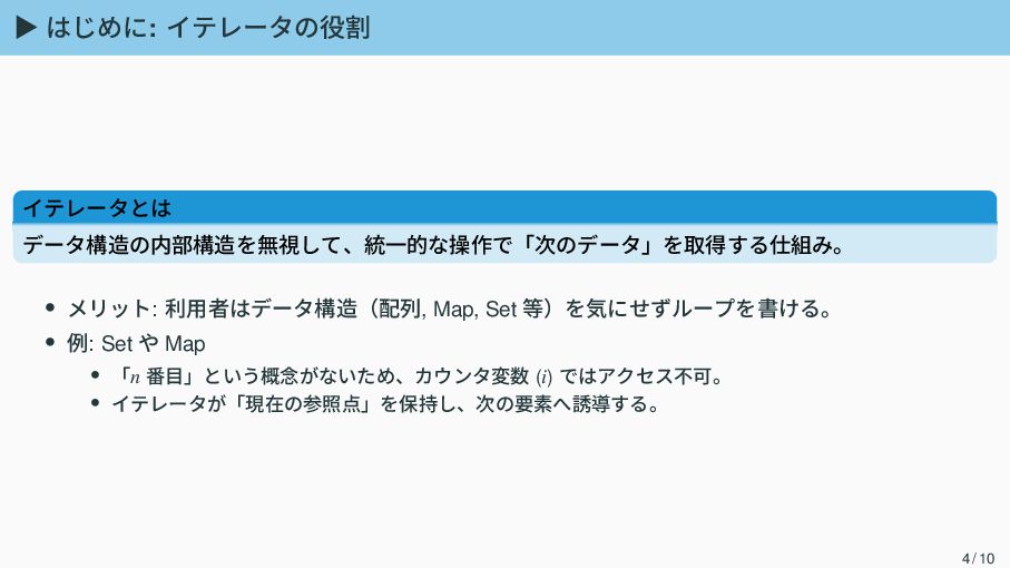 ▶ はじめに: イテレータの役割 イテレータとは データ構造の内部構造を無視して、統一的な操作で「次のデータ」を取得する仕組み。 • メリット: 利用者はデータ構造(配列, Map, Set
