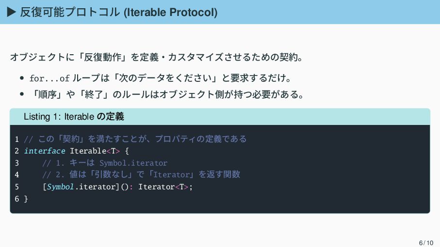 Listing 1: Iterable の定義 1 // この「契約」を満たすことが、プロパティの定義である 2 interface Iterable<T> { 3 // 1. キーは Symbol.iterator 4 // 2. 値は「引数なし」で「Iterator」を返す関数 5 [Symbol.iterator](): Iterator<T>; 6 } 6 / 10