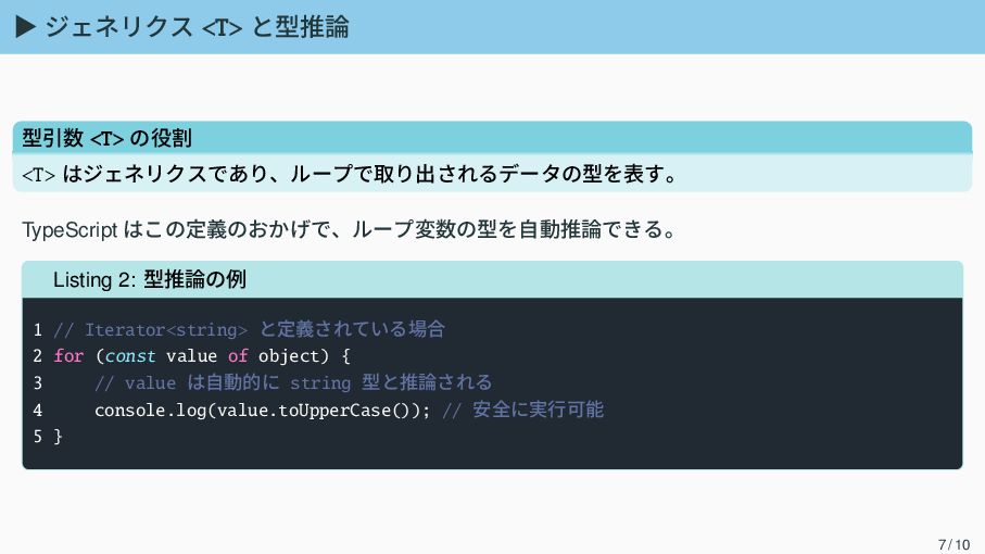 はこの定義のおかげで、ループ変数の型を自動推論できる。 Listing 2: 型推論の例 1 // Iterator<string> と定義されている場合 2 for (const value of object) { 3 // value は自動的に string 型と推論される 4 console.log(value.toUpperCase()); // 安全に実行可能 5 } 7 / 10