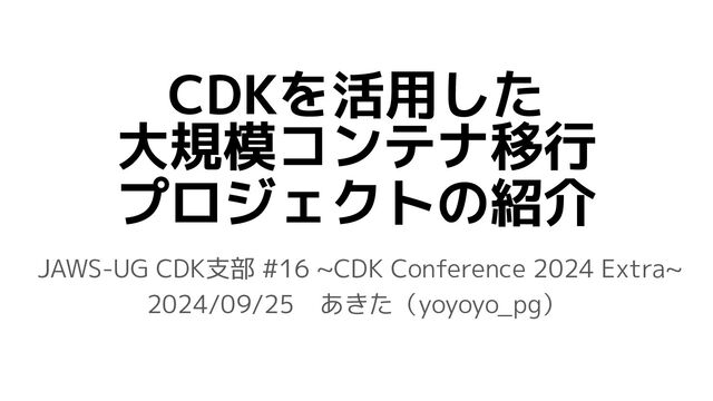 JAWS-UG CDK支部 #16 ~CDK Conference 2024 Extra~ 2024/09/25 あきた(yoyoyo_pg) CDKを活用した 大規模コンテナ移行