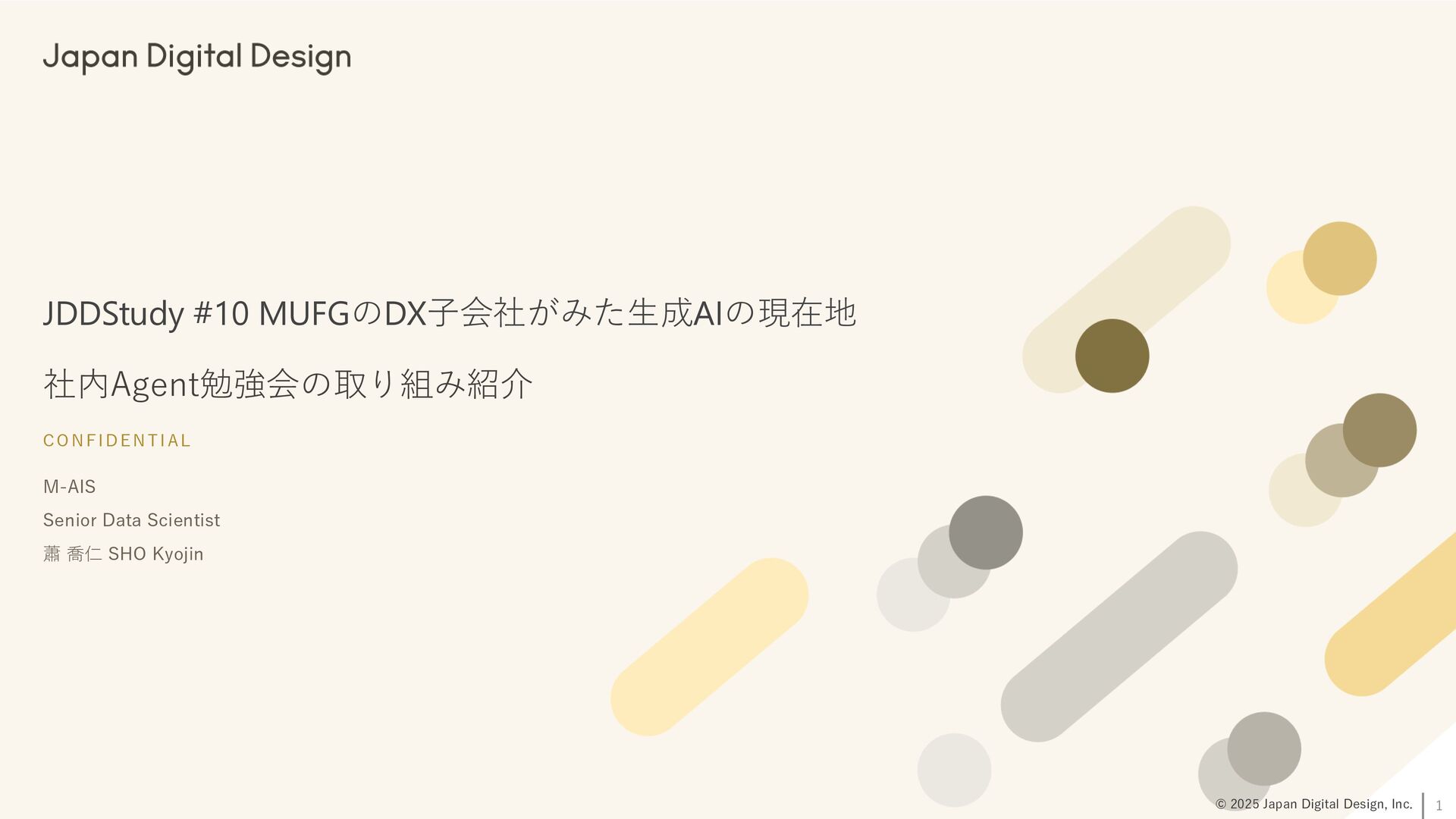 Design, Inc. M-AIS Senior Data Scientist 蕭 喬仁 SHO Kyojin JDDStudy #10 MUFGのDX子会社がみた生成AIの現在地 社内Agent勉強会の取り組み紹介