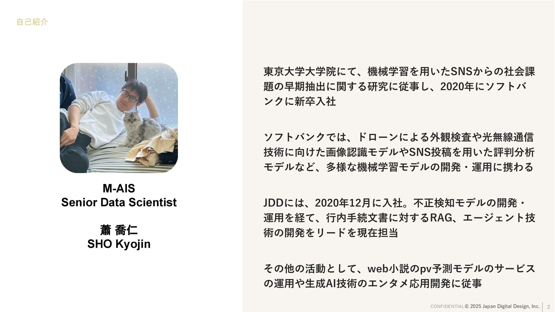 ンクに新卒入社 ソフトバンクでは、ドローンによる外観検査や光無線通信 技術に向けた画像認識モデルやSNS投稿を用いた評判分析 モデルなど、多様な機械学習モデルの開発・運用に携わる JDDには、2020年12月に入社。不正検知モデルの開発・ 運用を経て、行内手続文書に対するRAG、エージェント技 術の開発をリードを現在担当 その他の活動として、web小説のpv予測モデルのサービス の運用や生成AI技術のエンタメ応用開発に従事 M-AIS Senior Data Scientist 蕭 喬仁 SHO Kyojin