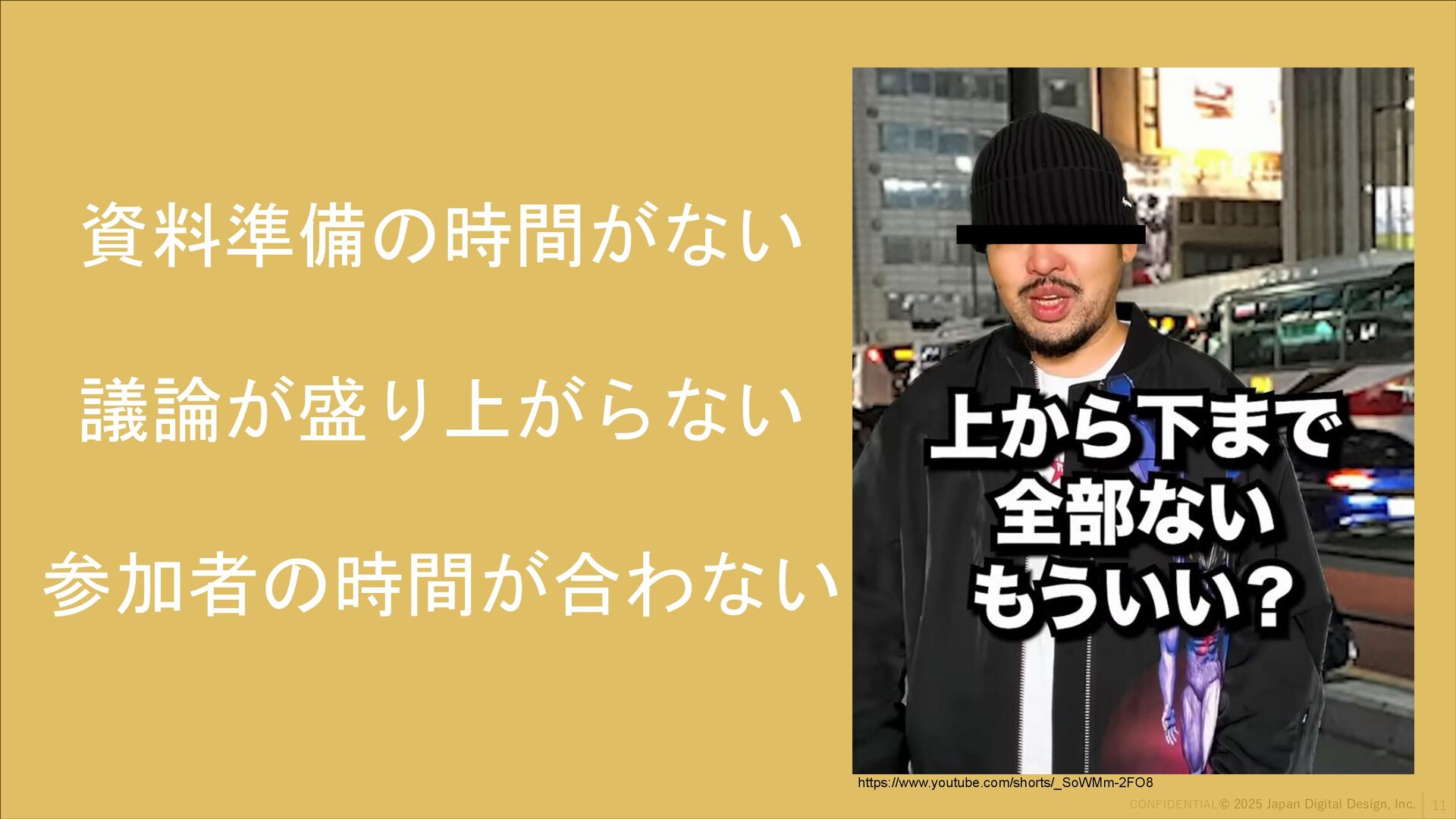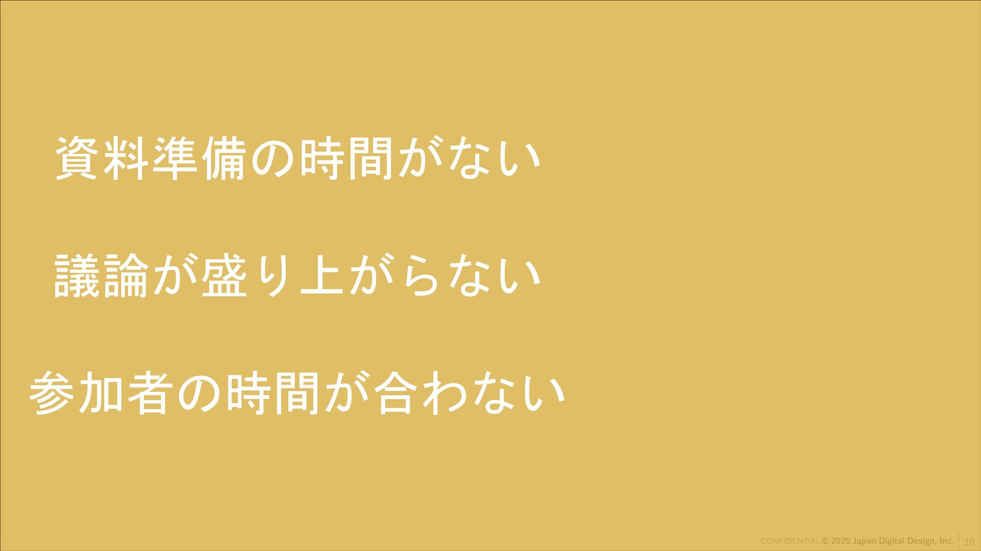 10 CONFIDENTIAL© 2025 Japan Digital Design, Inc. 資料準備の時間がない 議論が盛り上がらない 参加者の時間が合わない