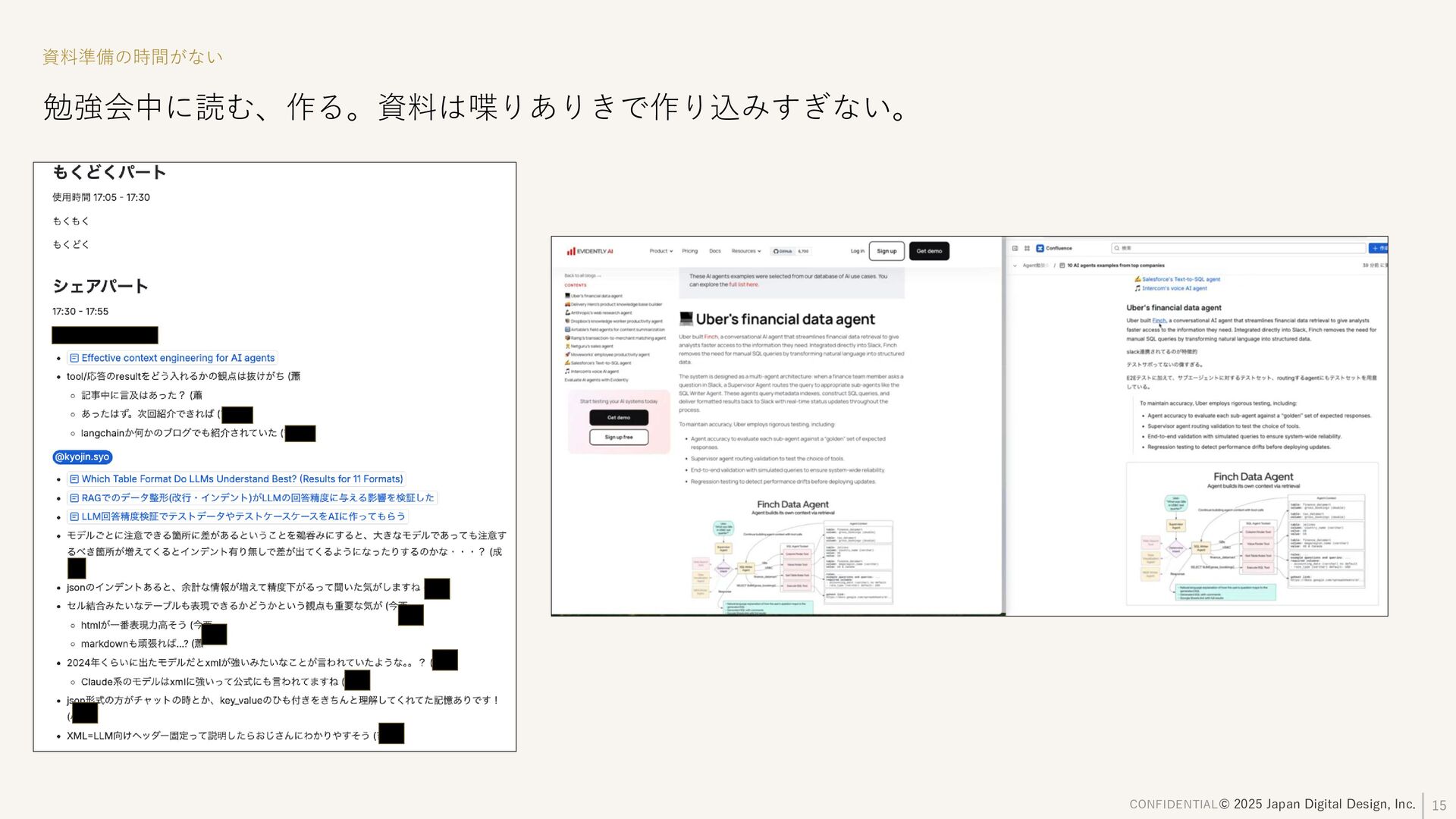 15 CONFIDENTIAL© 2025 Japan Digital Design, Inc. 勉強会中に読む、作る。資料は喋りありきで作り込みすぎない。 資料準備の時間がない