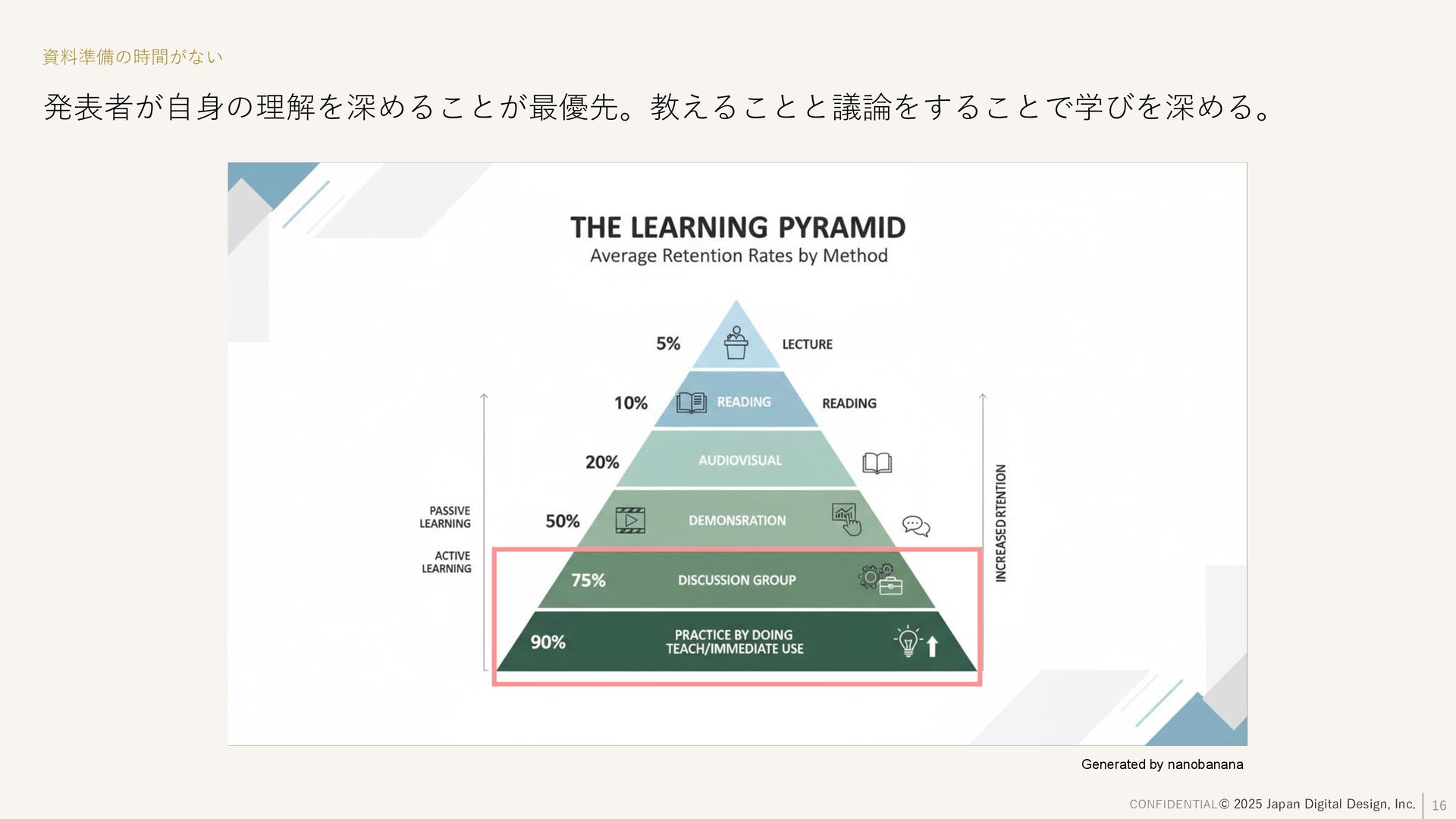 16 CONFIDENTIAL© 2025 Japan Digital Design, Inc. 発表者が自身の理解を深めることが最優先。教えることと議論をすることで学びを深める。 資料準備の時間がない Generated