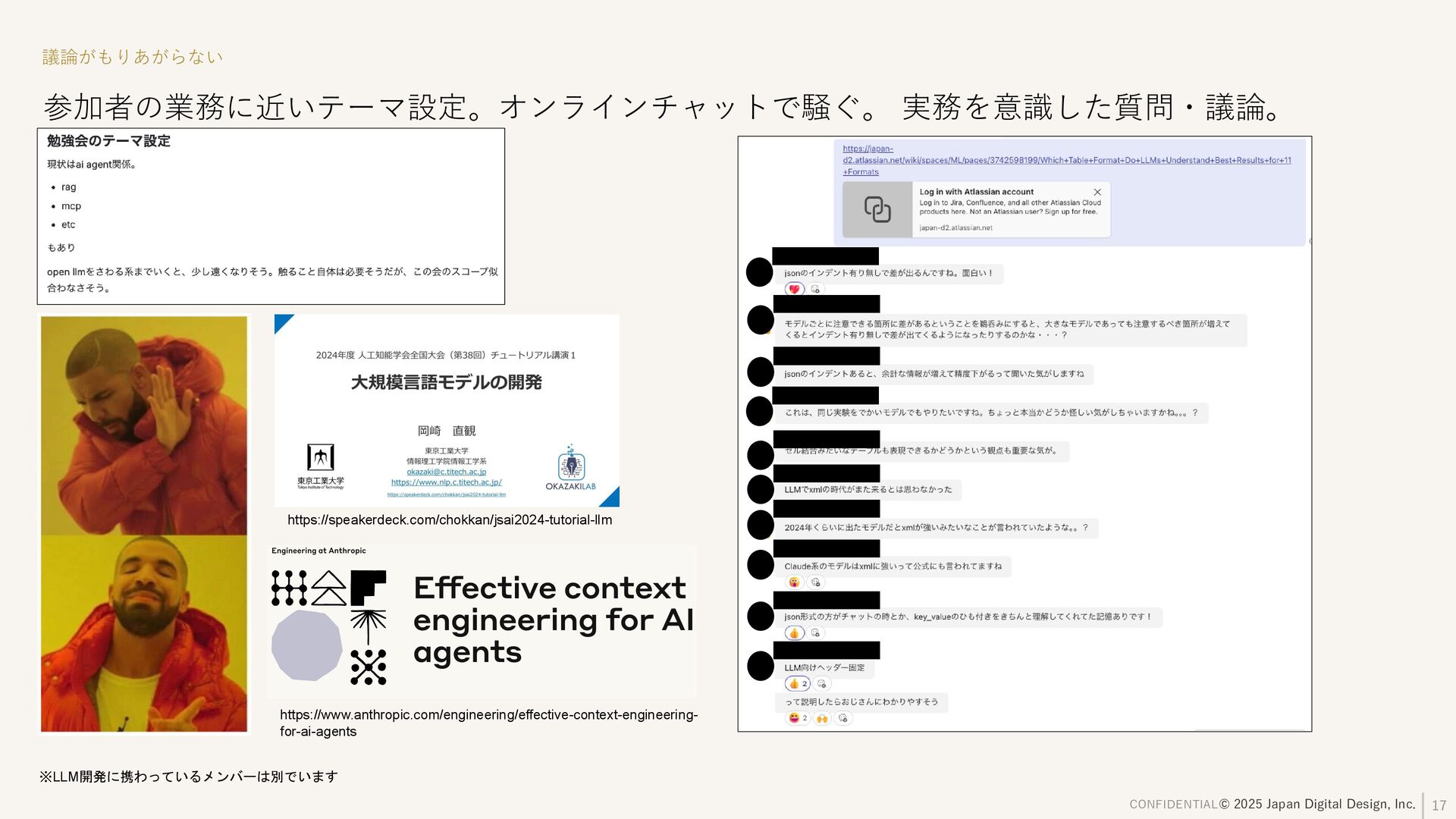 17 CONFIDENTIAL© 2025 Japan Digital Design, Inc. 参加者の業務に近いテーマ設定。オンラインチャットで騒ぐ。 実務を意識した質問・議論。 議論がもりあがらない