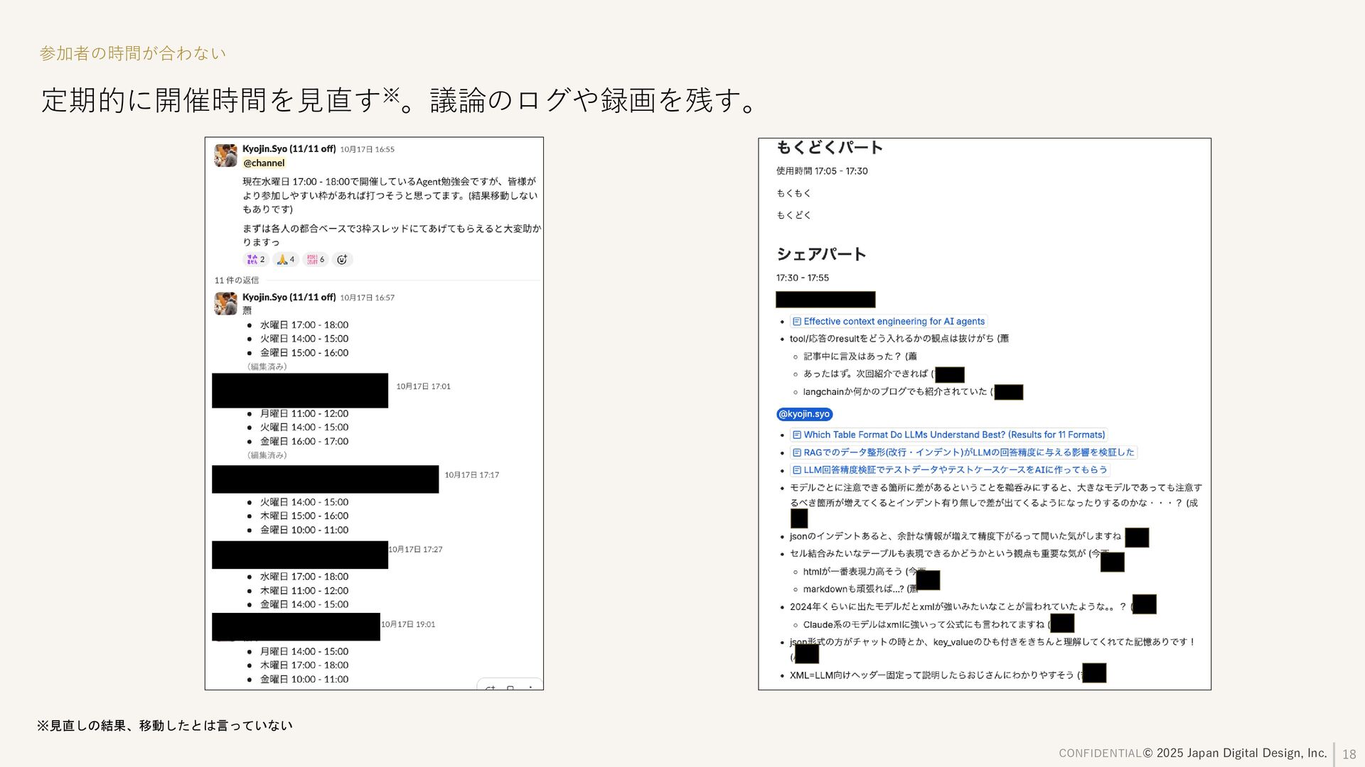 18 CONFIDENTIAL© 2025 Japan Digital Design, Inc. 定期的に開催時間を見直す※。議論のログや録画を残す。 参加者の時間が合わない ※見直しの結果、移動したとは言っていない