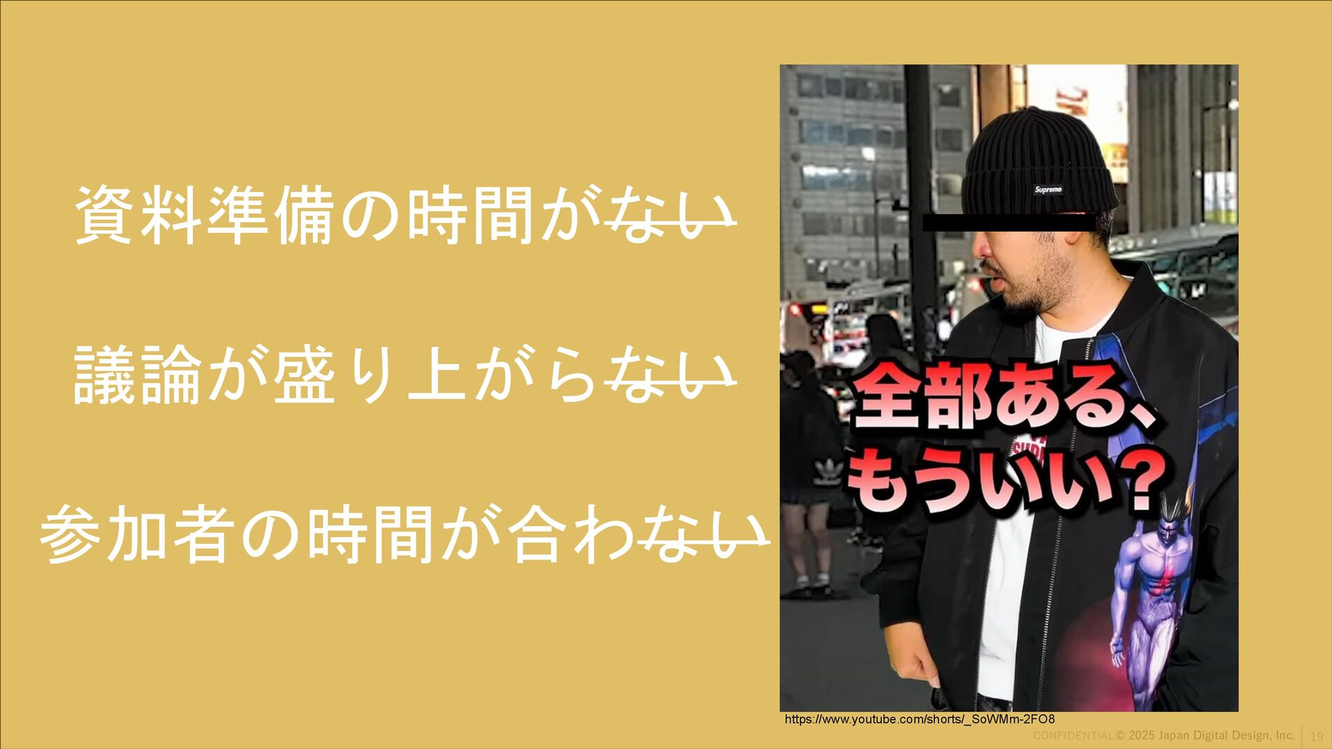 19 CONFIDENTIAL© 2025 Japan Digital Design, Inc. https://www.youtube.com/shorts/_SoWMm-2FO8 資料準備の時間がない 議論が盛り上がらない