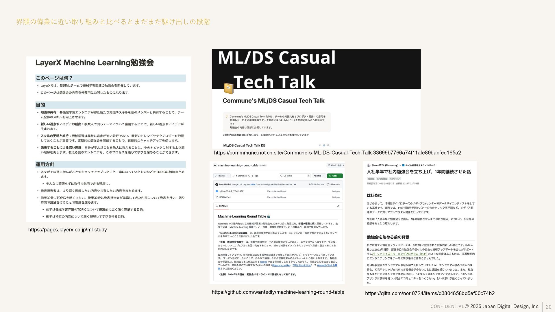 20 CONFIDENTIAL© 2025 Japan Digital Design, Inc. 界隈の偉業に近い取り組みと比べるとまだまだ駆け出しの段階 https://github.com/wantedly/machine-learning-round-table https://pages.layerx.co.jp/ml-study