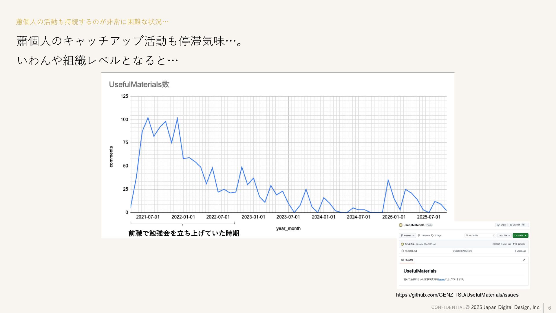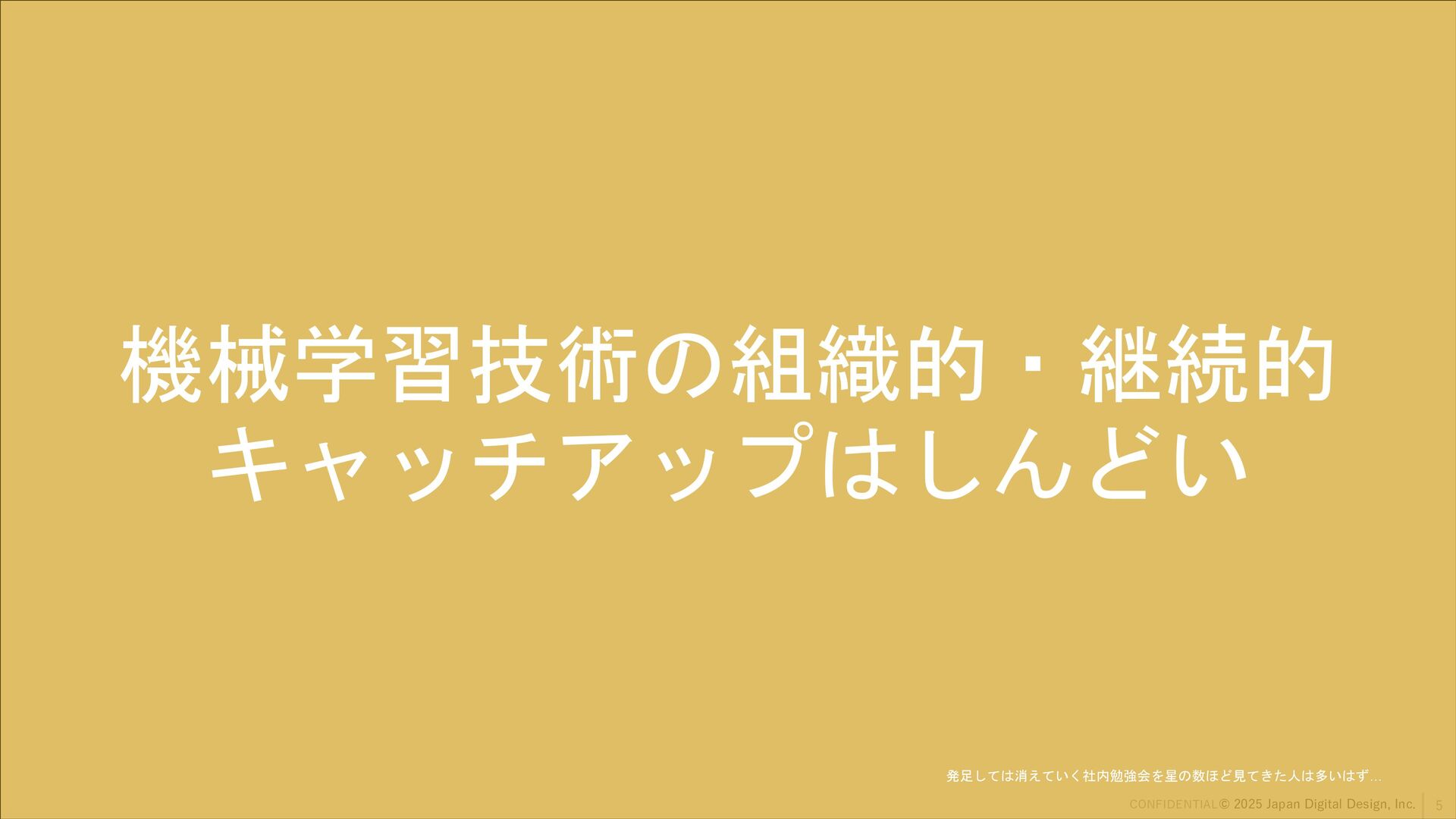 5 CONFIDENTIAL© 2025 Japan Digital Design, Inc. 機械学習技術の組織的・継続的 キャッチアップはしんどい 発足しては消えていく社内勉強会を星の数ほど見てきた人は多いはず…