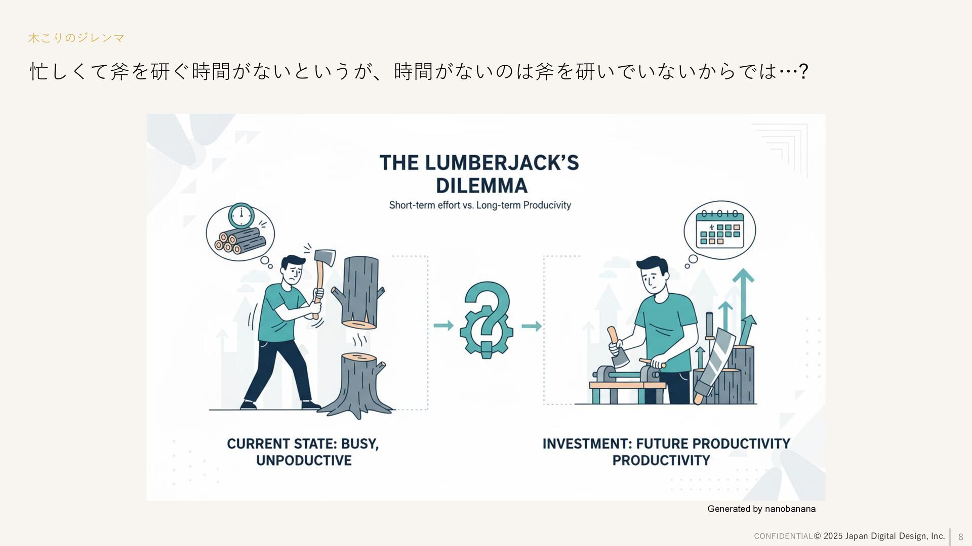8 CONFIDENTIAL© 2025 Japan Digital Design, Inc. 忙しくて斧を研ぐ時間がないというが、時間がないのは斧を研いでいないからでは…? 木こりのジレンマ Generated