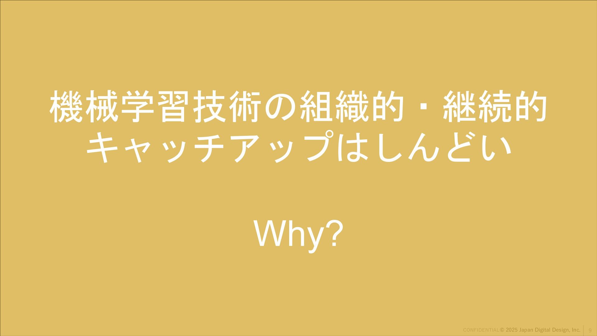 9 CONFIDENTIAL© 2025 Japan Digital Design, Inc. 機械学習技術の組織的・継続的 キャッチアップはしんどい Why?