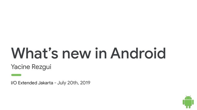 • Dark Theme ◦ Save phone’s battery and make it look cool • Live Caption ◦ Accessibility in all media streams • Wi-Fi network suggestion API ◦ Propose to connect to a WiFi network without typing credentials • Project Mainline ◦ Security updates through Google Play More news!