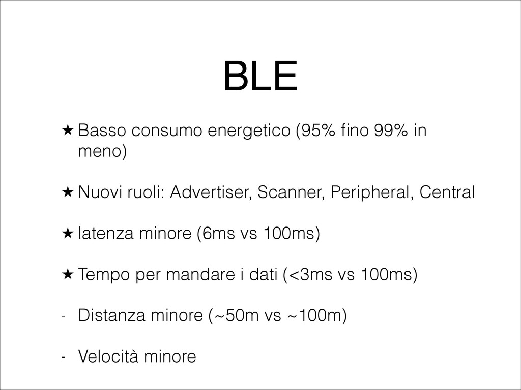 Nuovi ruoli: Advertiser, Scanner, Peripheral, Central ★ latenza minore (6ms vs 100ms) ★ Tempo per mandare i dati (<3ms vs 100ms) - Distanza minore (~50m vs ~100m) - Velocità minore BLE