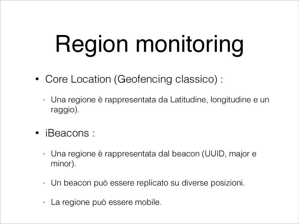 rappresentata da Latitudine, longitudine e un raggio). • iBeacons : - Una regione è rappresentata dal beacon (UUID, major e minor). - Un beacon può essere replicato su diverse posizioni. - La regione può essere mobile. Region monitoring