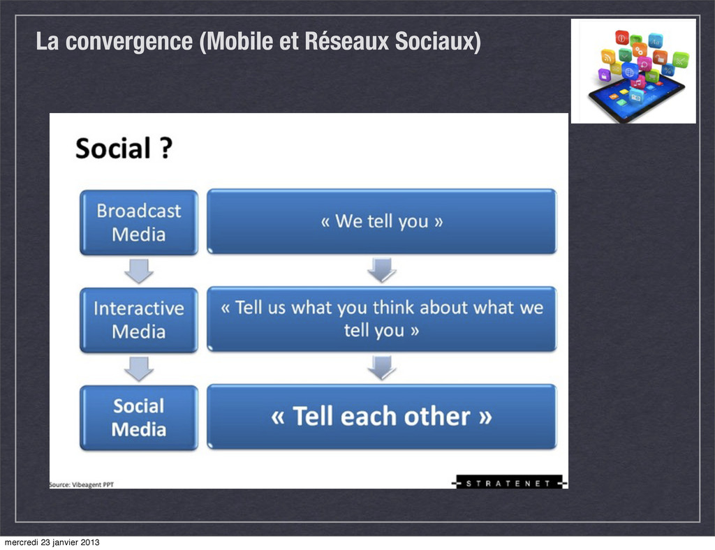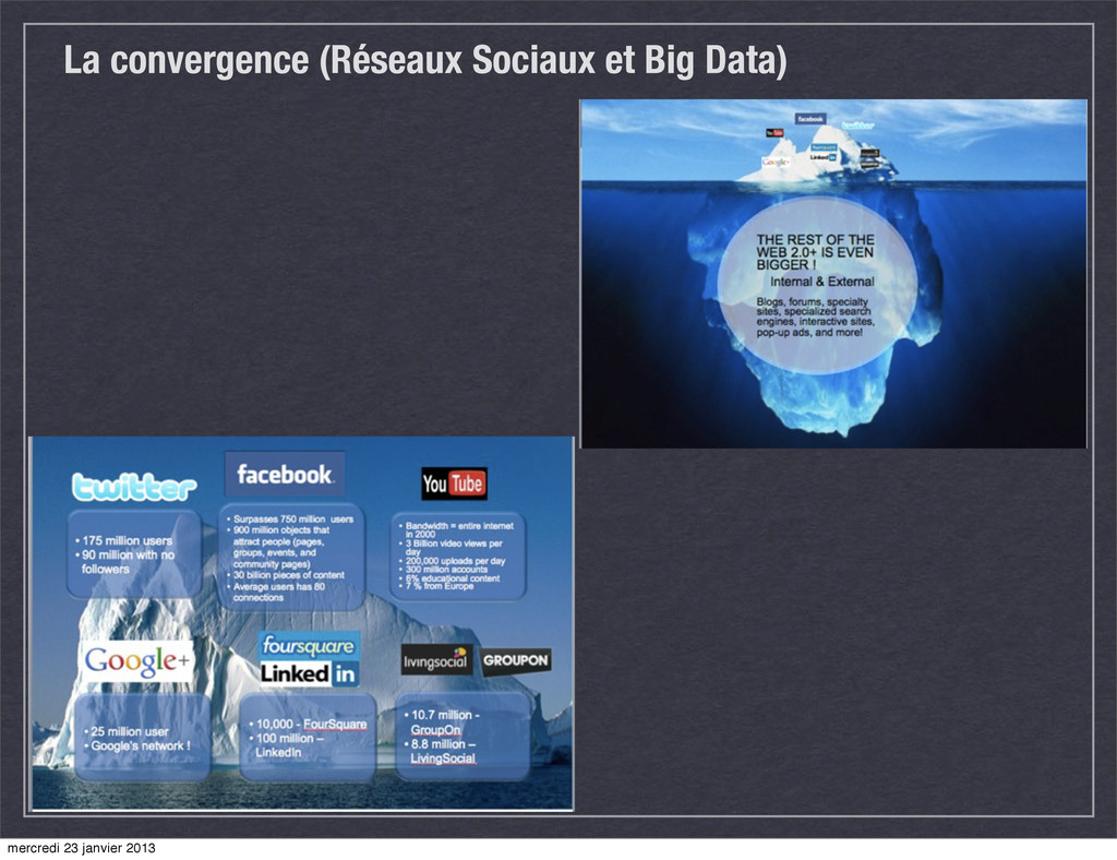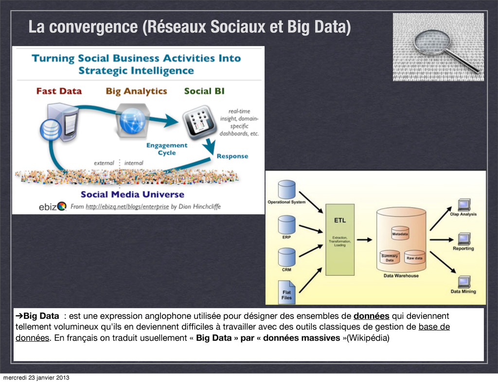 afin de comprendre les besoins et les comportement de leurs consommateurs. ➔ On a un grand volume de données disponible dans la sphère des médias sociaux: le défi comment accéder à ces informations et en faire des renseignements utilisables et actionable ➔ Il y a deux types d’approches pour analyse des données dans les médias sociaux: ➢Les outils de rapports par type de média: Channel Report Tools qui varient d’une solution commerciale comme radian6 qui offre un tableau de bord avec une multitude de fonctionnalités ou une solution gratuite comme Simply Measured qui offre des outils sous forme rapport sur excel : ce genre d’outils nous permet d’avoir juste une image globale de notre compagnie dans les médias sociaux . Ils ne permettent pas d’avoir une vue détaillé sur les comportements, les besoins et les tendances des individus consommateurs ou intéressé par notre service. ➢Les techniques analytiques et prédictives: permet de générer des patterns en se basant sur les données des médias-sociaux: les data dans le médias sociaux sont accessible à travers : -Un système API pour les developpeurs (Mash up); -Un outil Web qui permet de faire la recherche sur une thématique dans les réseaux sociaux: Socialmention -Des entreprises qui fournissent un service de scan des données dans les médias-sociaux: Sproutsocial, Datasift..etc La convergence (Réseaux Sociaux et Big Data) mercredi 23 janvier 2013