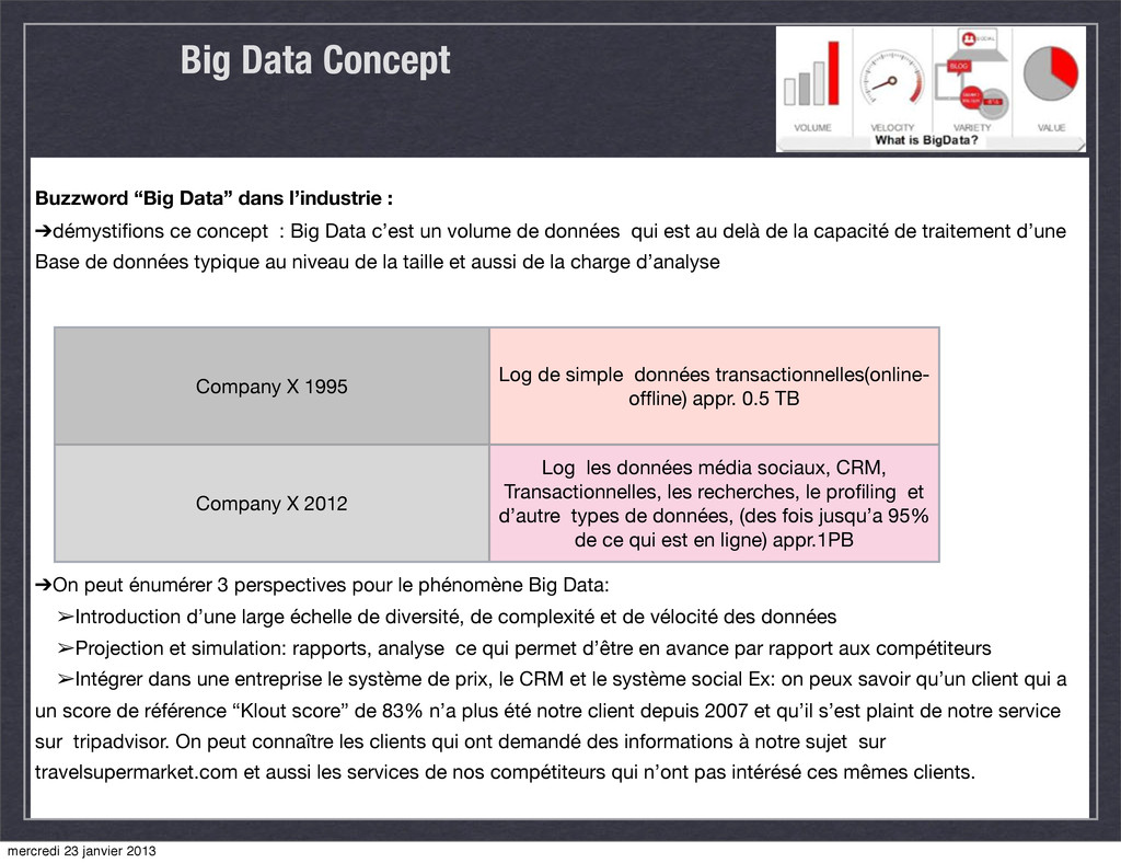ce concept : Big Data c’est un volume de données qui est au delà de la capacité de traitement d’une Base de données typique au niveau de la taille et aussi de la charge d’analyse ➔On peut énumérer 3 perspectives pour le phénomène Big Data: ➢Introduction d’une large échelle de diversité, de complexité et de vélocité des données ➢Projection et simulation: rapports, analyse ce qui permet d’être en avance par rapport aux compétiteurs ➢Intégrer dans une entreprise le système de prix, le CRM et le système social Ex: on peux savoir qu’un client qui a un score de référence “Klout score” de 83% n’a plus été notre client depuis 2007 et qu’il s’est plaint de notre service sur tripadvisor. On peut connaître les clients qui ont demandé des informations à notre sujet sur travelsupermarket.com et aussi les services de nos compétiteurs qui n’ont pas intérésé ces mêmes clients. Company X 1995 Log de simple données transactionnelles(online- offline) appr. 0.5 TB Company X 2012 Log les données média sociaux, CRM, Transactionnelles, les recherches, le profiling et d’autre types de données, (des fois jusqu’a 95% de ce qui est en ligne) appr.1PB mercredi 23 janvier 2013