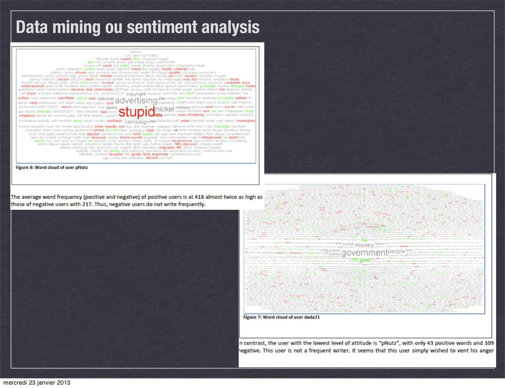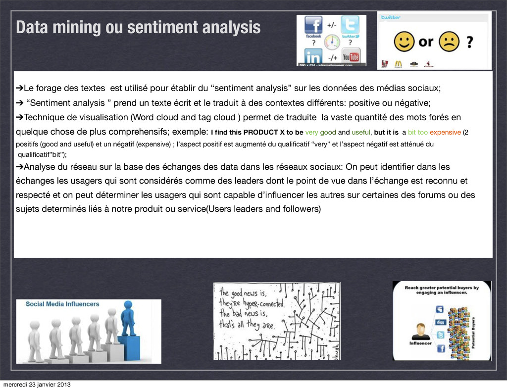analysis” sur les données des médias sociaux; ➔ “Sentiment analysis ” prend un texte écrit et le traduit à des contextes différents: positive ou négative; ➔Technique de visualisation (Word cloud and tag cloud ) permet de traduite la vaste quantité des mots forés en quelque chose de plus comprehensifs; exemple: I find this PRODUCT X to be very good and useful, but it is a bit too expensive (2 positifs (good and useful) et un négatif (expensive) ; l’aspect positif est augmenté du qualificatif “very” et l’aspect négatif est atténué du qualificatif”bit”); ➔Analyse du réseau sur la base des échanges des data dans les réseaux sociaux: On peut identifier dans les échanges les usagers qui sont considérés comme des leaders dont le point de vue dans l’échange est reconnu et respecté et on peut déterminer les usagers qui sont capable d’influencer les autres sur certaines des forums ou des sujets determinés liés à notre produit ou service(Users leaders and followers) Data mining ou sentiment analysis mercredi 23 janvier 2013