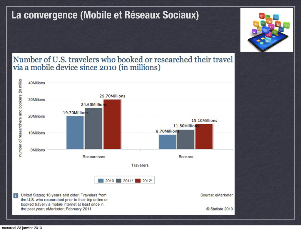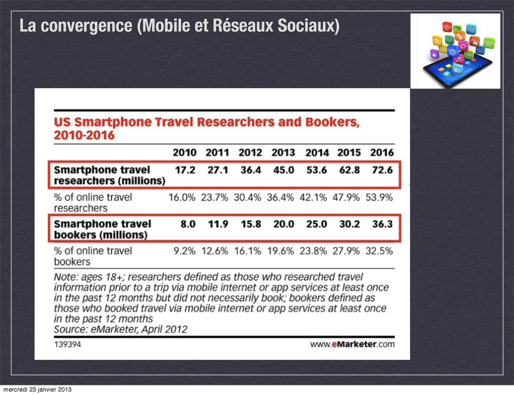 dans les plateformes mobiles par le biais d’une application ou d’un site optimisé: ➔ En 2012, 38% des voyageurs d’agrément et 57% des voyageurs d’affaires ont utilisé leur téléphone intelligent pour effectuer une recherche en ligne liée au voyage (source :Google & Ipsos MediaCT, août 2012). ➔ 22% des Américains, 16% des Allemands, 13% des Français et des Britanniques, et 10% des Italiens préfèrent réserver leur chambre d’hôtel au moyen d’un site ou d’une application mobile (source: Trivago, juillet 2012). ➔ 40% des mobinautes français souhaitent réserver de l’hébergement ou du transport via mobile, et 35% souhaitent pouvoir modifier un dossier existant. (PhocusWright, septembre 2012). mercredi 23 janvier 2013