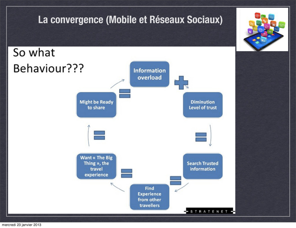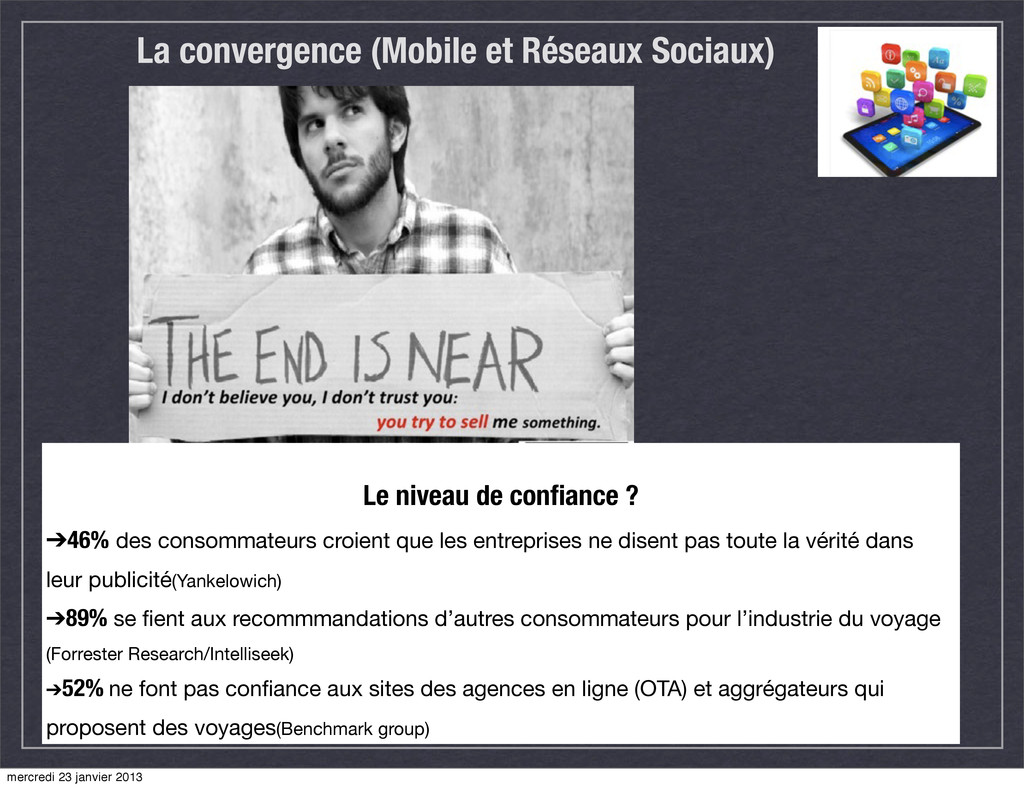 ? ➔46% des consommateurs croient que les entreprises ne disent pas toute la vérité dans leur publicité(Yankelowich) ➔89% se fient aux recommmandations d’autres consommateurs pour l’industrie du voyage (Forrester Research/Intelliseek) ➔52% ne font pas confiance aux sites des agences en ligne (OTA) et aggrégateurs qui proposent des voyages(Benchmark group) mercredi 23 janvier 2013