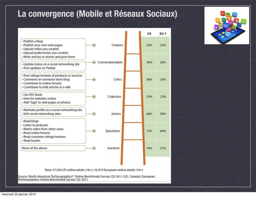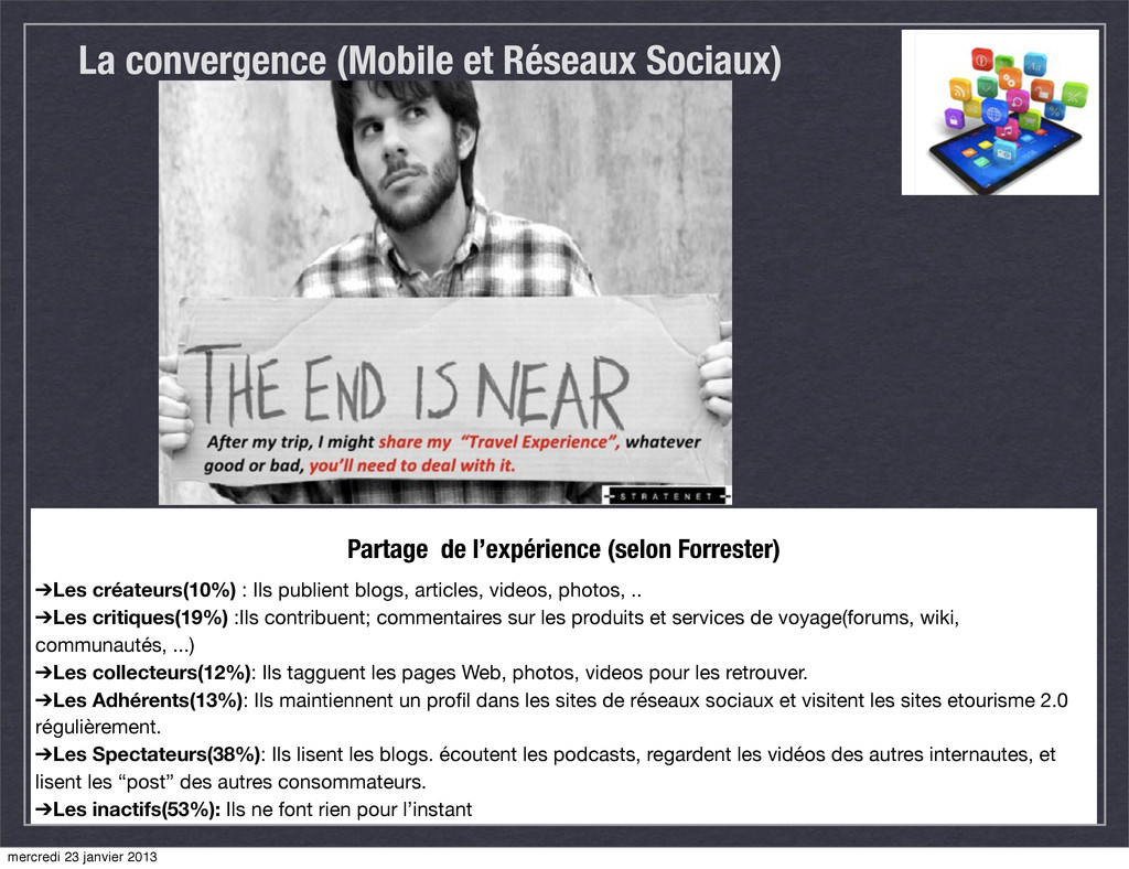 Forrester) ➔Les créateurs(10%) : Ils publient blogs, articles, videos, photos, .. ➔Les critiques(19%) :Ils contribuent; commentaires sur les produits et services de voyage(forums, wiki, communautés, ...) ➔Les collecteurs(12%): Ils tagguent les pages Web, photos, videos pour les retrouver. ➔Les Adhérents(13%): Ils maintiennent un profil dans les sites de réseaux sociaux et visitent les sites etourisme 2.0 régulièrement. ➔Les Spectateurs(38%): Ils lisent les blogs. écoutent les podcasts, regardent les vidéos des autres internautes, et lisent les “post” des autres consommateurs. ➔Les inactifs(53%): Ils ne font rien pour l’instant mercredi 23 janvier 2013