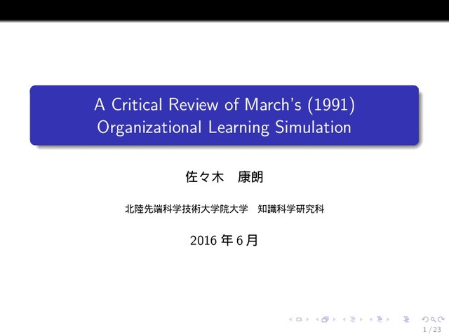 K. M. Carley. Simulation modeling in organizational and management research. Academy of Management Review, 32(4):1229–1245, 2007. J. G. March. Exploration and exploitation in organizational learning. Organization Science, 2(1):71–87, 1991. ೖࢁষӫ. ϏδωεεΫʔϧͰֶͳ͍ੈք࠷ઌͷܦӦֶ, ܦ BP ࣾ, 2015. ࢤଜ݈Ұ. Ϛʔνͷ૬ޓֶशϞσϧʹ͍ͭͯ. ླྀٿେֶܦࡁݚڀ, 70: 75-90, 2005. ߴڮ৳. ৫ϧʔνϯͱ৫Τίϩδʔ. ৫Պֶ, 32(2):54–77. 1998. ࡾ༔لɾߴڮ৳. ૬ޓֶशϞσϧͷຊͷ݁. Ϛωδϝϯτɾ ϨϏϡʔ, 13(9):353–370, 2014. 23 / 23