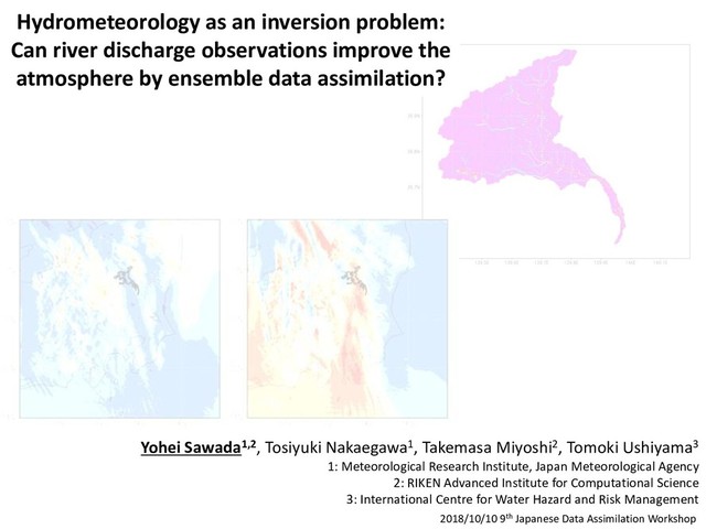 prediction obs TIGGE multimodel [Bougeault et al, 2010] forcings HTESSEL[Balsamo et al., 2009 HESS] CaMa-Flood[Yamazaki et al., 2011 WRR] obs Global flood prediction [Zsoter et al., 2016 JHM] Global flood prediction was achieved by combining atmospheric multmodel ensemble, land surface model, and hydrodynamic model.