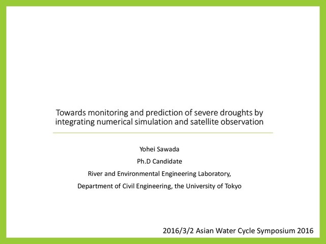 simulation and satellite observation Yohei Sawada Ph.D Candidate River and Environmental Engineering Laboratory, Department of Civil Engineering, the University of Tokyo 2016/3/2 Asian Water Cycle Symposium 2016