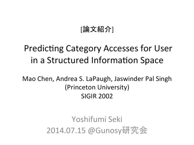 in an episode are given equal preference score regardless of when and how oXen they are accessed • Frequency analysis – Counts the number of accesses to every category in an episode as the category’s preference score • Recency analysis – Each access in an episode a weight according the age of access. • Sequen*al analysis – User repeats similar traversal path from *me to *me. Under this assump*on, a user’s access aXer a sequence of accesses can be inferred from the old known paths that include the sequence