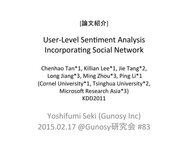Chenhao Tan*1, Killian Lee*1, Jie Tang*2, Long Jiang*3, Ming Zhou*3, Ping Li*1 (Cornel University*1, Tsinghua University*2, MicrosoL Research Asia*3) KDD2011 Yoshifumi Seki (Gunosy Inc) 2015.02.17 @Gunosy研究会 #83