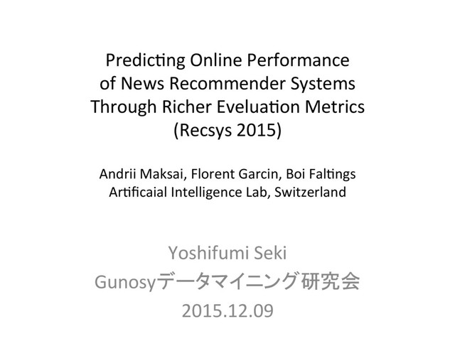 Metrics (Recsys 2015) Andrii Maksai, Florent Garcin, Boi Fal'ngs Ar'ficaial Intelligence Lab, Switzerland Yoshifumi Seki Gunosyデータマイニング研究会 2015.12.09