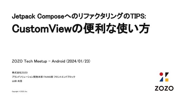Jetpack ComposeへのリファクタリングのTIPS: CustomViewの便利な使い方 株式会社ZOZO ブランドソリューション開発本部 FAANS部 フロントエンドブロック 山田 尚吾 Copyright
