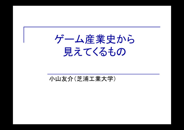 ・賭博機 ・わいせつ デザイン史 or ジャンル史 ・PONG→BREAKOUT →スペースインベーダー ・ADV:単語入力→コマンド選択 ・RPG:ターン制→ATB ゲームタイトル史 マリオ,DQ,FF… ゲームハード史 FC,MD,PS,Xbox… 企業史 or 経営史 ・ナムコ,セガ,タイトー… ・任天堂,バンダイ… ・スクウェア,エニックス,光栄… ・ガンホー,CyGames,… ・GREE,DeNA… ゲーム産業史 議論の対象: 継続的に利益を上げ,事業体を存続させることを目的とした さまざま企業の活動と,その活動に消費者がどう反応し,ど のような結果を生み出し続けたか ・歴史を左右させる局面を理解するためには、他の視点で の歴史の知識も必要 ・タイトル,社会的規制,技術的ブレークスルー…
