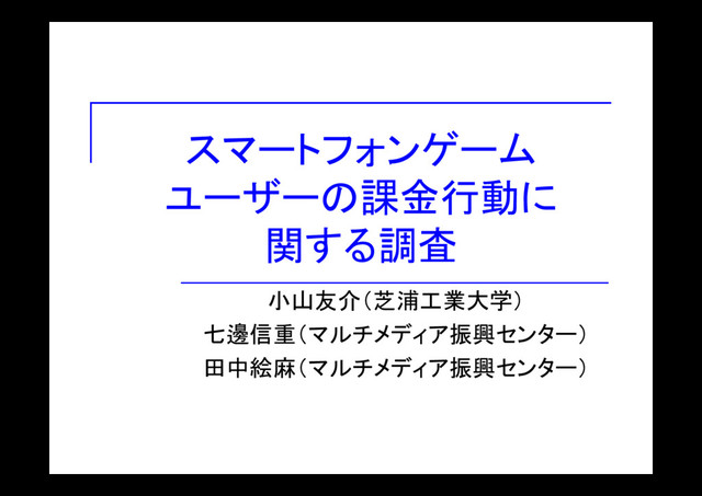 スマートフォンゲーム ユーザーの課金行動に 関する調査 小山友介(芝浦工業大学) 七邊信重(マルチメディア振興センター) 田中絵麻(マルチメディア振興センター)