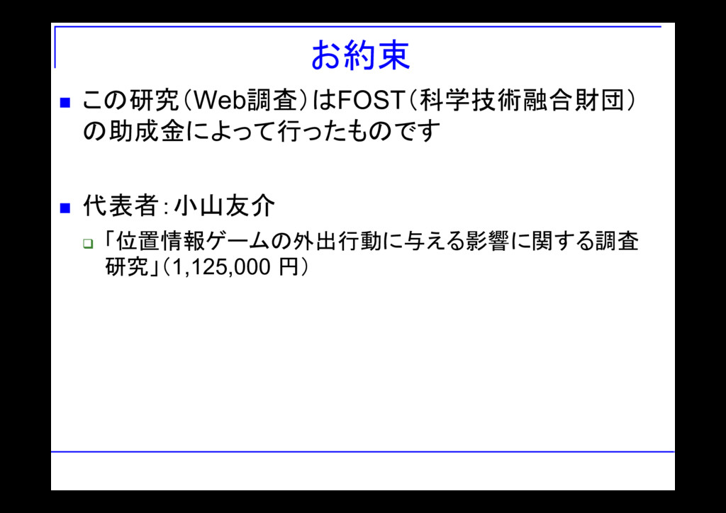 お約束 この研究(Web調査)はFOST(科学技術融合財団) の助成金によって行ったものです 代表者:小山友介 「位置情報ゲームの外出行動に与える影響に関する調査 研究」(1,125,000 円)