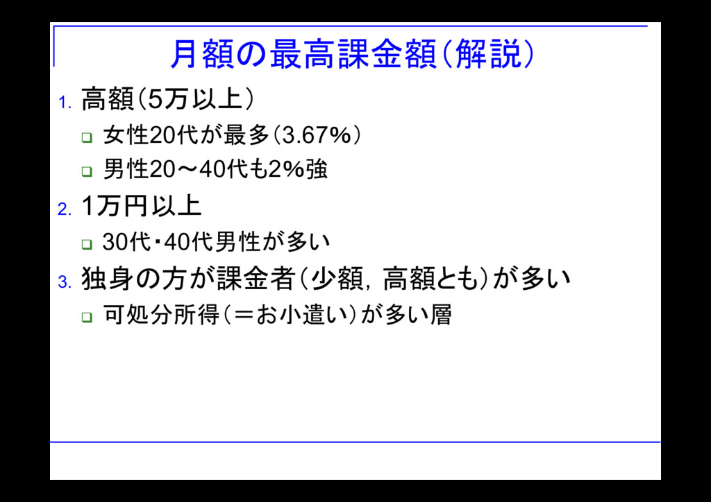 月額の最高課金額(解説) 1. 高額(5万以上) 女性20代が最多(3.67%) 男性20~40代も2%強 2. 1万円以上