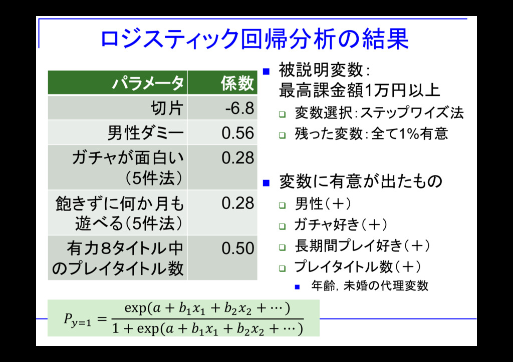 ロジスティック回帰分析の結果 パラメータ 係数 切片 -6.8 男性ダミー 0.56 ガチャが面白い (5件法) 0.28