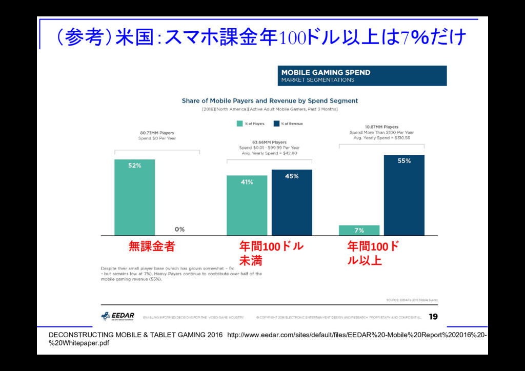 (参考)米国:スマホ課金年100ドル以上は7%だけ DECONSTRUCTING MOBILE & TABLET GAMING 2016 http://www.eedar.com/sites/default/files/EEDAR%20-Mobile%20Report%202016%20- %20Whitepaper.pdf