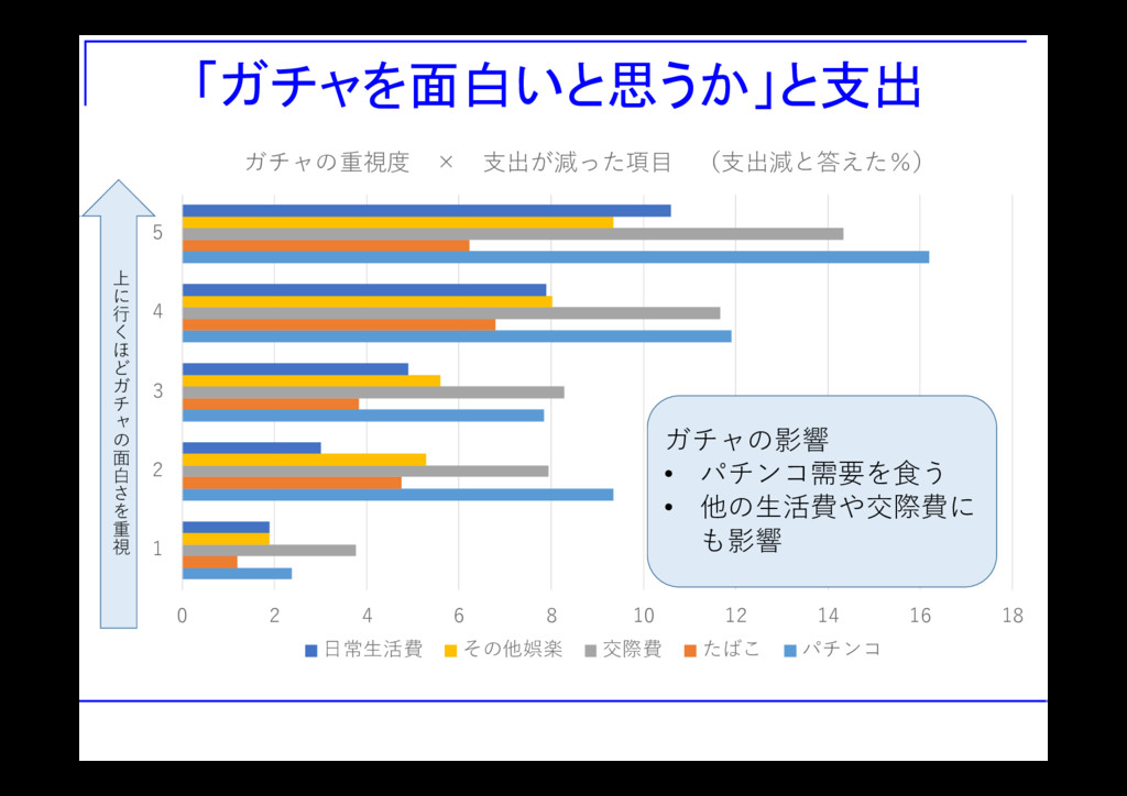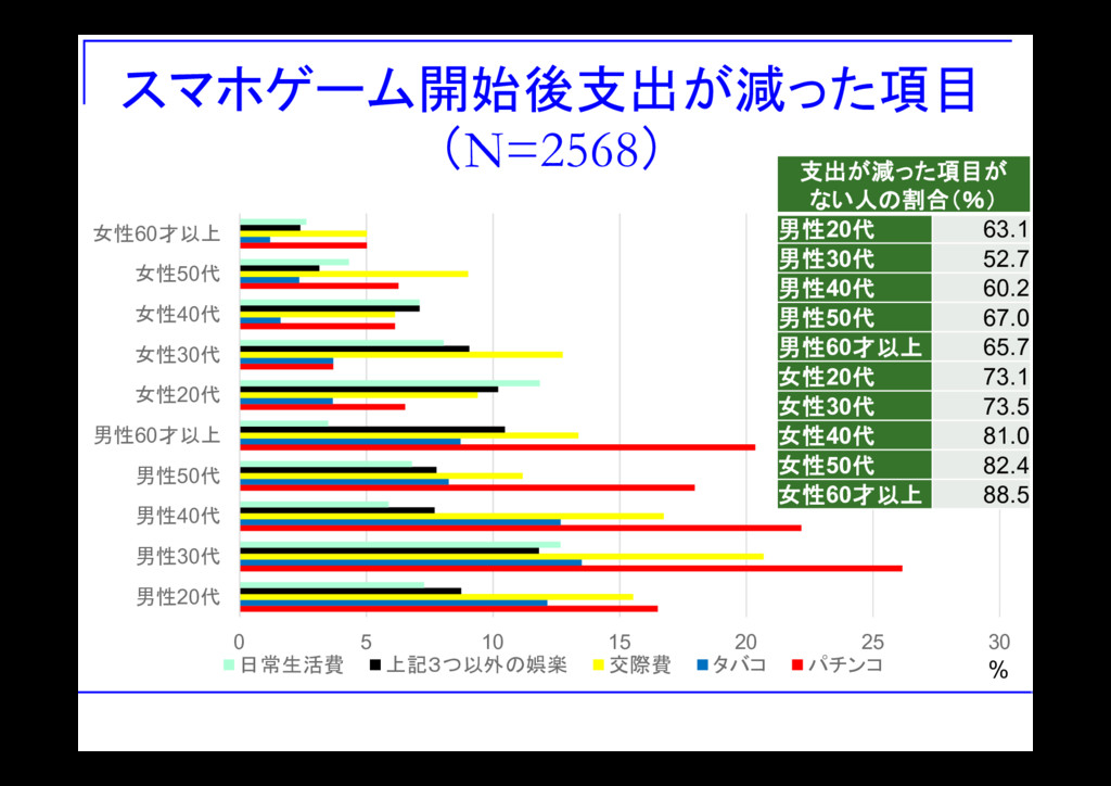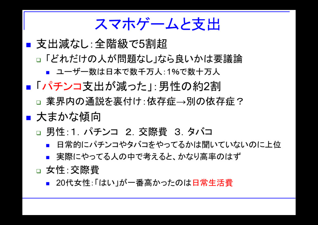 スマホゲームと支出 支出減なし:全階級で5割超 「どれだけの人が問題なし」なら良いかは要議論 ユーザー数は日本で数千万人:1%で数十万人 「パチンコ支出が減った」:男性の約2割