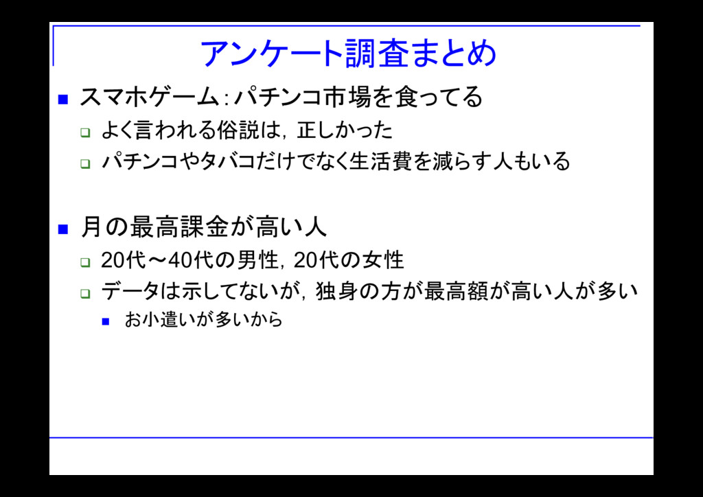 アンケート調査まとめ スマホゲーム:パチンコ市場を食ってる よく言われる俗説は,正しかった パチンコやタバコだけでなく生活費を減らす人もいる 月の最高課金が高い人