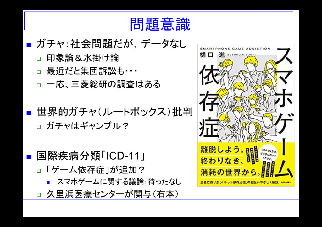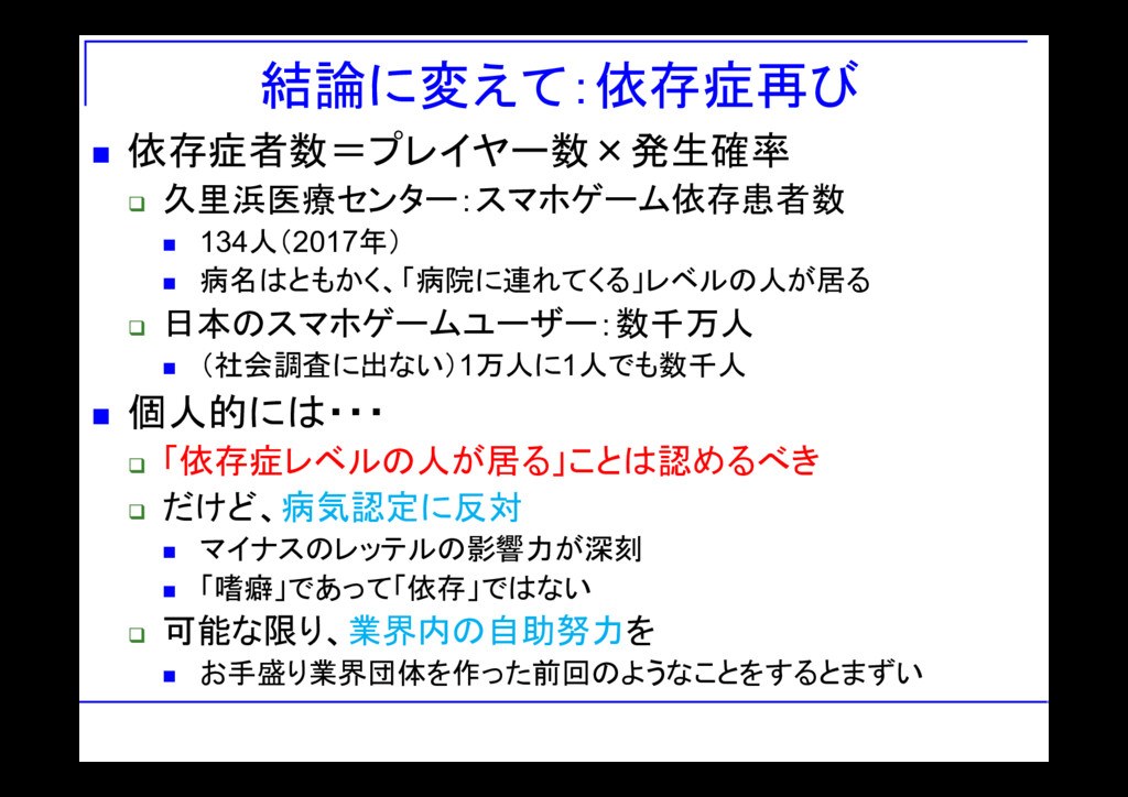 日本のスマホゲームユーザー:数千万人 (社会調査に出ない)1万人に1人でも数千人 個人的には・・・ 「依存症レベルの人が居る」ことは認めるべき だけど、病気認定に反対 マイナスのレッテルの影響力が深刻 「嗜癖」であって「依存」ではない 可能な限り、業界内の自助努力を お手盛り業界団体を作った前回のようなことをするとまずい