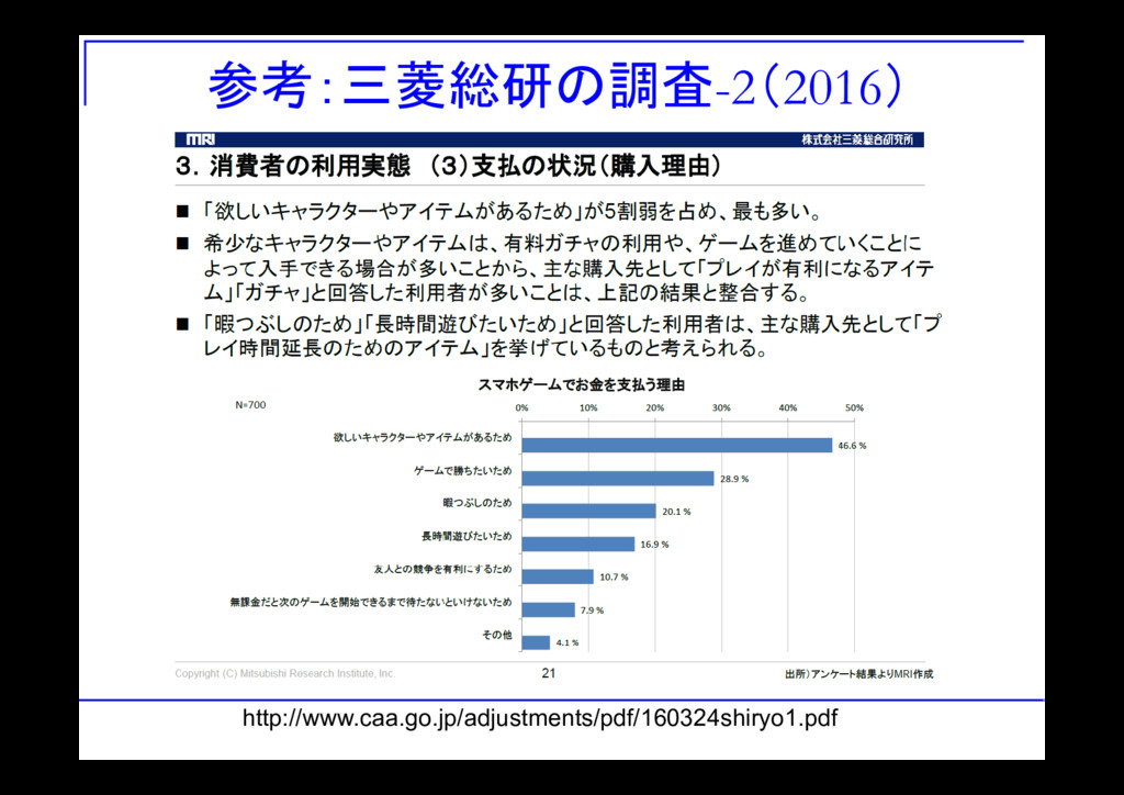 問題意識 ガチャ:社会問題だが,データなし 印象論&水掛け論 最近だと集団訴訟も・・・ 一応、三菱総研の調査はある