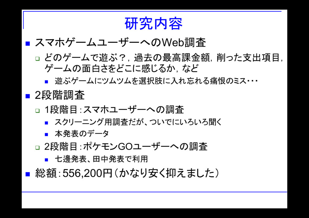 1段階目:スマホユーザーへの調査 スクリーニング用調査だが、ついでにいろいろ聞く 本発表のデータ 2段階目:ポケモンGOユーザーへの調査 七邊発表、田中発表で利用 総額:556,200円(かなり安く抑えました)