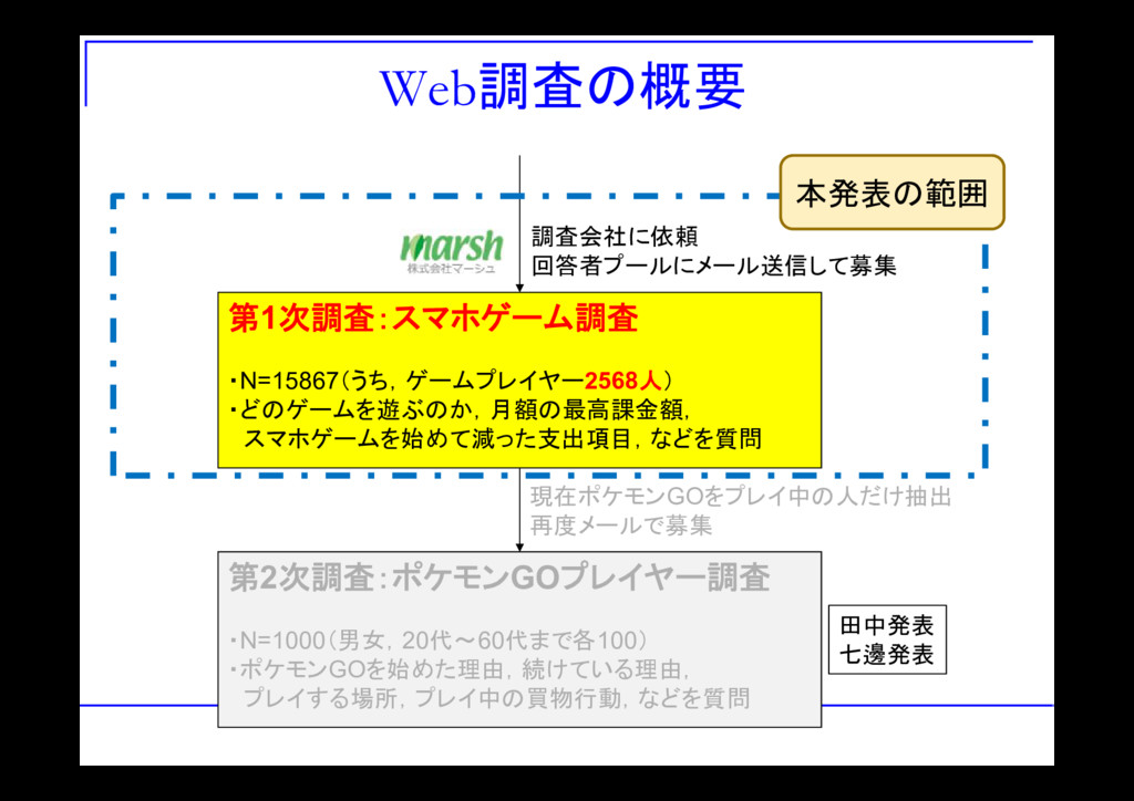 再度メールで募集 調査会社に依頼 回答者プールにメール送信して募集 本発表の範囲 田中発表 七邊発表